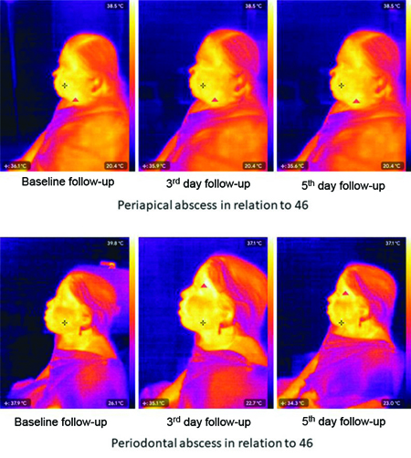 Odontogenic inflammatory lesions represent inflammatory changes residing in the pulpal, periapical and periodontal tissue regions that are associated with pain and swelling. Local variations in tissue temperature significantly imply alterations in blood supply and tissue metabolism characteristic of a particular pathology [1]. Body surface temperature changes can be used to detect a variety of diseases since they indicate variations in blood flow and metabolism in particular regions [2]. Therefore, absolute differences in thermal levels should be measured during the diagnostic assessment of the lesion using a non invasive, non ionising and non contact diagnostic imaging technique known as infrared thermography [3].