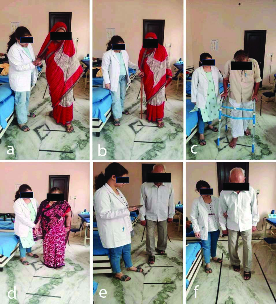 a) Group A performing Frenkel’s exercise; b) Group A walking with cane; and c) Group A walking with frame; d) Group B performing Frenkel’s exercise; e) Group B walking with assistance of auditory cue (by counting 1,2,3 and start/rest); and f) Group B walking with assistance of visual cue (patient was asked to walked within the strips).