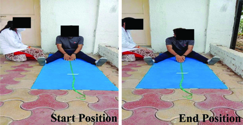 1. V-sit and reach test [14]: This test was conducted to measure lower limb flexibility according to standard procedures [14]. The test is shown in [Table/Fig-1]. The test was repeated three times. The distance from the starting position to the reach position was measured in centimeters, and an average of the three readings was determined [Table/Fig-1].
