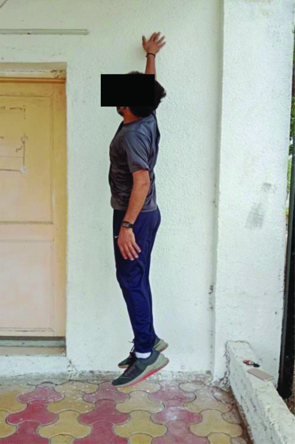 3. Vertical Jump Test (VJT) [13]: This test was conducted to assess lower limb muscle power according to standard procedures [13]. The test is shown in [Table/Fig-3]. The average of three trials was recorded. Vertical jump performance was calculated as maximal jump height minus reach height (cm) [Table/Fig-3].