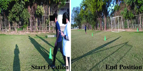 5 Forty yard dash test [20]: This test was conducted to assess the sprinting ability of players according to standard procedures [20]. The test is shown in [Table/Fig-5]. Two trials were performed, and the best time was recorded. Note that 40 yards equals 36.58 meters [Table/Fig-5].