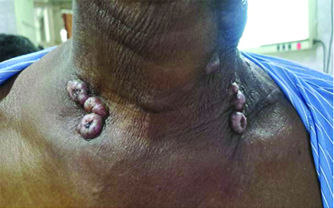 Oral cavity cancer, which includes carcinoma of the tongue, floor of the mouth, gums and lips, is the most common cancer in the head and neck region [1]. SCC is the most common histological variant. Direct extension and invasion of adjacent structures (80-90%) and lymphatic spread (50-70%) are the common modes of spread for this tumour. In advanced cases of SCC, haematogenous dissemination occurs, with common sites being the lungs, liver, bones, brain, kidneys, adrenal glands, pancreas and skin, in decreasing order of frequency [2]. Metastatic subcutaneous nodules are reported in approximately 2-5% of cases of SCC of the tongue [3]. The present patient presented with multiple dome-shaped skin nodules in the neck after a span of one year following the diagnosis and treatment. Fine Needle Aspiration Cytology (FNAC) and biopsy from the nodules confirmed metastatic deposits. Radiological evaluation excluded other metastatic foci.