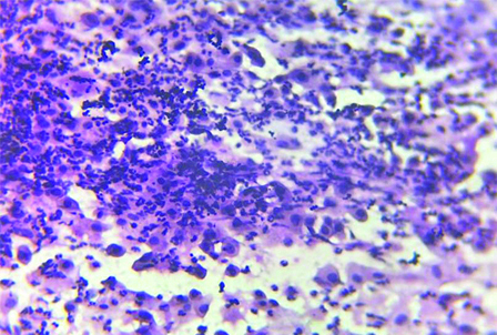 FNAC from the nodules showing atypical squamous cells with suppuration (Pap stain, 400x).