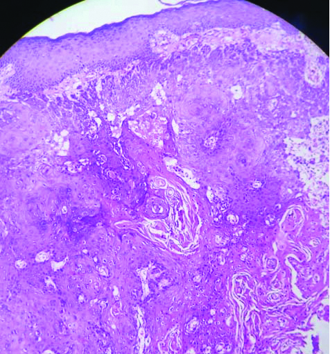 Skin with an infiltrating neoplasm composed of polygonal cells and areas of keratin pearls (H&E,100x).