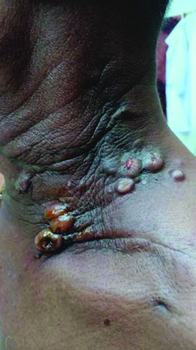 After a year of disease-free interval, he presented with enlarged left level V cervical neck nodes. An Fluorodeoxyglucose Positron Emission Tomography Contrast-enhanced Computed Tomography (FDG PET CECT) scan revealed this as the only site of disease; hence, he underwent completion radical neck dissection and was found to have infiltration of the sternocleidomastoid muscle, internal jugular vein, spinal accessory nerve, and surrounding muscles by the neck nodal mass. Histopathological review confirmed an SCC recurrence with extranodal extension. After four weeks, he presented with multiple umbilicated and tender skin nodules on the anterior aspect of the neck [Table/Fig-1]. Fine Needle Aspiration Cytology (FNAC) aspirated a light brown fluid of less than 0.5 mL. Smears revealed predominantly atypical squamous cells in a background of suppuration, favoring a diagnosis of SCC [Table/Fig-2]. An incisional biopsy was performed to confirm the diagnosis of SCC and to exclude the possibility of other primary cutaneous or appendage tumours and keratoacanthoma. Microscopy confirmed infiltrating SCC [Table/Fig-3]. He was started on palliative chemotherapy; however, the patient developed many similar nodules on the anterior and lateral sides of the neck [Table/Fig-4]. His general condition continues to deteriorate.