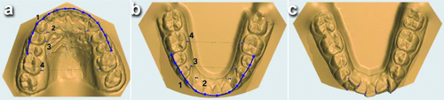 a) Occlusal view of the maxillary model showing 1- Arch Perimeter (AP), 2- Inter Canine Width (ICW), 3- Interpremolar (IPW) and 4- Intermolar Width (IMW); b) Occlusal view of the mandibular model showing 1- Arch Perimeter (AP), 2- Inter Canine Width (ICW), 3- Interpremolar (IPW) and 4- Intermolar Width (IMW); c) Occlusal view of the mandibular model showing contact point displacement measurement.