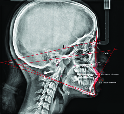 Lateral cephalogram showing SNA, SNB, ANB, Mandibular Plane Angle (MPA), upper incisor to NA (U1/NA) angle and linear distance, lower incisor to NB (L1/NB) angle and linear distance, Frankfort-mandibular Plane Angle (FMA), Incisor-mandibular Plane Angle (IMPA), and Frankfort-mandibular Incisor Angle (FMIA).