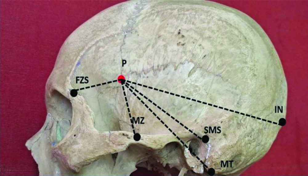 Based on morphological characteristics, the sphenoparietal, frontotemporal, stellate and epipteric types of pterion were defined [3]. Skulls were also categorised based on either symmetrical or asymmetrical distribution of these sutural patterns on either side. For metric analysis, linear distances between the center of the pterion and adjacent standard anatomical bony landmarks were measured using a digital vernier caliper with an accuracy of 0.01 mm. Five linear measurements were taken on either side for pterion [Table/Fig-1], as follows: