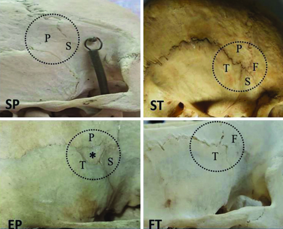Morphological variations of pterion: SP-Sphenoparietal; ST- Stellate; EP-Epipteric; FT-Frontotemporal; S-Sphenoid; P-Parietal; T-Temporal; F-Frontal; *sutural bone.