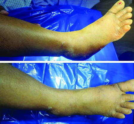 A 45-year-old female presented to the Emergency Department four hours following a road traffic accident, with a grossly swollen right ankle and foot, along with an inability to bear weight. Minor abrasions were noted over the lateral malleolus [Table/Fig-1]. The swelling was sudden in onset, firm in consistency and diffusely present around the medial and lateral malleoli, extending to the anterior aspect of the ankle joint and the dorsum of the midfoot. The distal neurovascular status was intact.