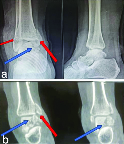 a) Anteroposterior (AP) and lateral radiographs of ankle; and b) Computed tomography coronal section of ankle showing fracture pattern. {Blue arrow showing talus fracture, Red arrow showing medial (large) and lateral (small) malleolus}.