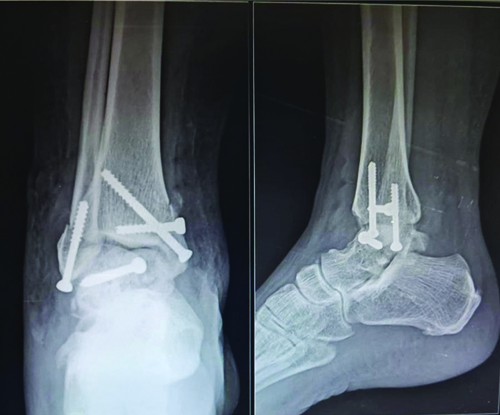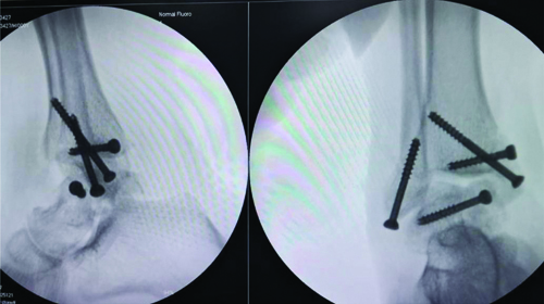 With the patient in the supine position, a medial approach was utilised along the medial malleolar fracture line to expose the talar fracture. The deltoid ligament was protected along with the medial malleolar fragment. The minimally comminuted talar fracture was reduced and fixed with Arbeitsgemeinschaft für Osteosynthesefragen (AO) cancellous lag screws under fluoroscopic guidance. The reduction was optimal due to minimal resorption of the comminuted ends. The medial and lateral malleoli were also fixed with cancellous screws [Table/Fig-3,4].
