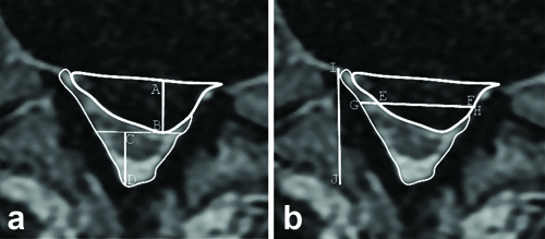 a) Visualisation of quantitative indicators of disc herniation from an MRI image. Herniation AP length (AB), herniation area (the upper area bounded by a thick line), canal AP length (CD) and canal area (the bottom area); b) Display of measurements determining HI calculation. Herniation width (EF), total canal width (GH) and total canal length (IJ).