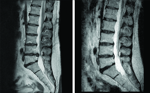 Example illustrating the comparison of a sagittal T2-weighted MRI image obtained during the initial visit (left) with that acquired after the completion of the treatment program (right).