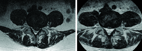 | 5 | There is a left median-paramedian herniation with the disc extending into the intervertebral foramen at the L4-L5 level. In the left lateral recess of L5, there is isointense tissue to the disc present in close proximity to the cauda equina nerve roots, at the extramedullary intradural site. | There is a notable decrease in the size of the left-sided median and paramedian herniation at the L4-L5 level. The signal intensity of the cauda equina appears normal. |