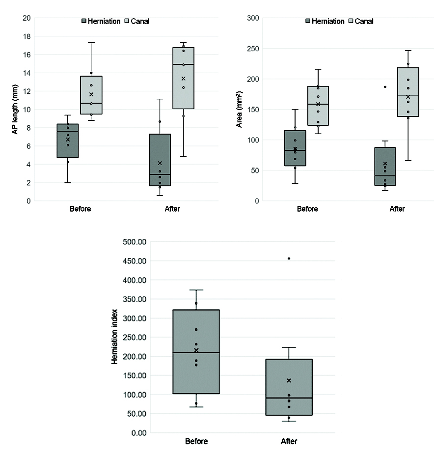 Box plot graphs depicting changes based on quantitative indicators from MRI images captured before the initiation of the treatment program (before) and upon its conclusion (after) are presented. Data set’s distribution is visualised by showing the minimum, first quartile, median, third quartile, and maximum values. The graphs illustrate a comparison of herniation and canal AP length (upper left), herniation and canal area (upper right), and HI (bottom left).