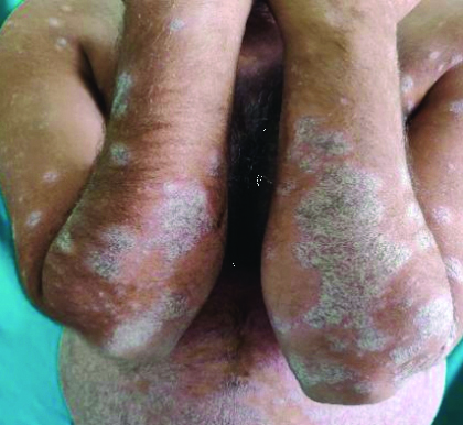 Showing chronic plaque-type psoriasis involving upper limbs and trunk.