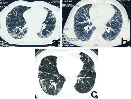 HRCT Chest of psoriasis patients showing: (a) UIP pattern; (b) NSIP pattern; (c) CPFE pattern.