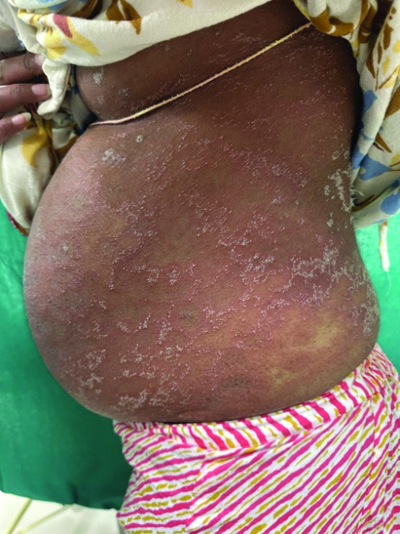 Having diagnosed the case as Impetigo Herpetiformis (IH), most likely secondary to HCQ, the culprit drug was discontinued and the patient was started on capsule cyclosporine 100 mg twice daily (3 mg/kg/day), along with calcium and protein supplementation, antihistamines and emollients. A significant symptomatic improvement ensued, evident by prompt resolution of the pustules [Table/Fig-4,5]. Two weeks later, the cyclosporine dose was tapered to 150 mg/day; however, this led to a flare-up of the skin lesions, necessitating the reinstatement of the previous dosing. Subsequently, a more gradual and careful tapering was implemented, reducing the dose by 50 mg/day every four weeks, reaching a daily dose of 50 mg at 36 weeks. The pregnancy was closely monitored for any signs of symptomatic flare-up or cyclosporine-induced adverse events. Additionally, the pregnancy was monitored for any signs of placental insufficiency or foetal distress that might warrant early induction of labour. Eventually, a healthy male child was delivered vaginally at 39 weeks, following which the cyclosporine dose was further tapered to 50 mg every alternate day for four weeks and then stopped after achieving complete symptomatic resolution. The patient followed-up a month later and there were no signs of a relapse in the mother or adverse outcomes in the child.