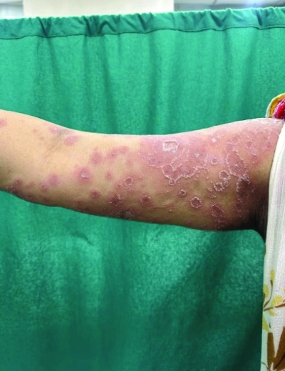 Multiple well-defined erythematous round patches studded with ring-shaped pustules at the periphery over the right arm.
