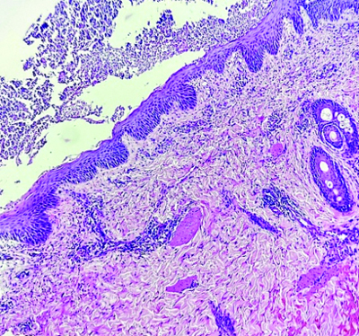 Histopathological examination showing mild acanthosis and spongiosis. A large sub-corneal pustule is seen filled with neutrophils and neutrophilic debris. Superficial dermis shows neutrophilic infiltrate extending into the epidermis while deep dermis shows perivascular and periadnexal neutrophilic infiltrate (H&E, 40X).
