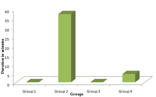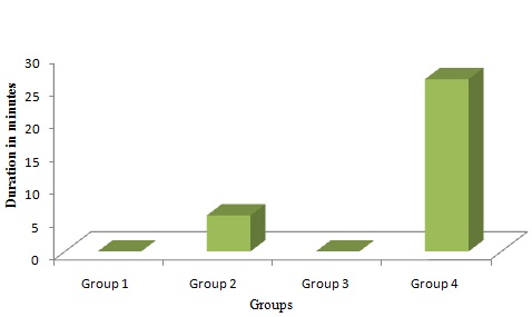The study includes total number of 24 rats divided into four groups of six rats each and received the drugs accordingly. The time of onset of hind limb paralysis & total duration of paralysis recorded in minutes in each group has been provided in [Table/Fig-1 and 2]. There was no hind limb paralysis seen with Group 3 Verapamil 2.5 mg/kg [Table/Fig-1 and 3]. Neuromuscular blockade action was seen with Group 4 Verapamil 10mg/kg., but the onset of action was delayed (26.3 min ±4.3 min ) compared to Group 2 Standard treated with Pancuronium (5.5 min ± 1.5 min). Group 4 Verapamil 10mg/kg showed shorter duration of hind limb paralysis. (25.8 min ± 19.4 min) compared to Group 2 Standard (37.3 min ± 6.8 min) [Table/Fig-2 and 4].The results of intra and inter group comparisons were statistical significant (p≤0.05).