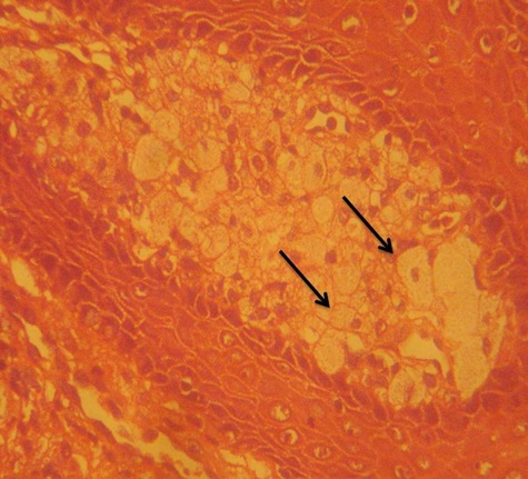 Given the occurrence of VX in masticatory mucosa, mainly in the gingiva, the possibility of trauma or inflammatory reasons can be considered as main etiological factor. Zagarelli et al., suggested the concept that local trauma and inflammation lead to epithelial entrapment and the cause of accumulation of lipid containing macrophages is epithelial degeneration. The products of epithelial breakdown elicit an inflammatory response which is manifested by a predominant neutrophilic infiltrate in the epithelium and a subsequent release of lipid material through the epithelium that finally is scavenged by the macrophages. [15] This theory was supported by several authors and suggested a local irritant as the initiator of this process. Ide et al., suggested few possible oral agents as etiological factors such as wet micro–environment, periodontal pathogens, mechanical stimuli, tobacco, alcohol, drugs, sensitizing or allergic substances of food stuffs and dental materials [16].