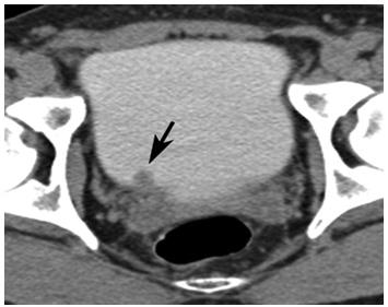 CTurogramsobtained during excretory phase show a 12-mm mass (arrow) near the right ureterovesical junction
