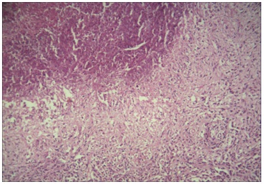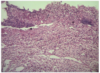 Inflammatory necrotic area (left upper corner) seen along with viable tissue showing inflammatory infiltrate.(H&E X 10)