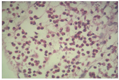 CTKUB showed a filling defect in the right lateral wall of bladder near vesicoureteric junction [Table/Fig-1]. Cystoscopy showed a mass lesion which measured 1.5x1x0.5 cm, over right vesicoureteric junction .Transurethral resection of the lesion was carried out and the sample was subjected to a histopathological examination. Grossly, the specimen consisted of grey white soft tissue fragments which measured 1.5x1x0.5 cm. Microscopy showed an ulcerated transitional epithelium with stromal oedema and congested blood vessels [Table/Fig-2]. There was diffuse infiltration of mucosa by eosinophils and few lymphocytes, with areas of haemorrhage and inflammatory necrosis [Table/Fig-3 and 4]. There was no evidence of malignancy or parasites in the sections which were studied.The patient was treated with corticosteroids, antimicrobial agents and antihistaminics and his post–operative period was uneventful. Until recent follow up, the patient was asymptomatic and there was no recurrence.