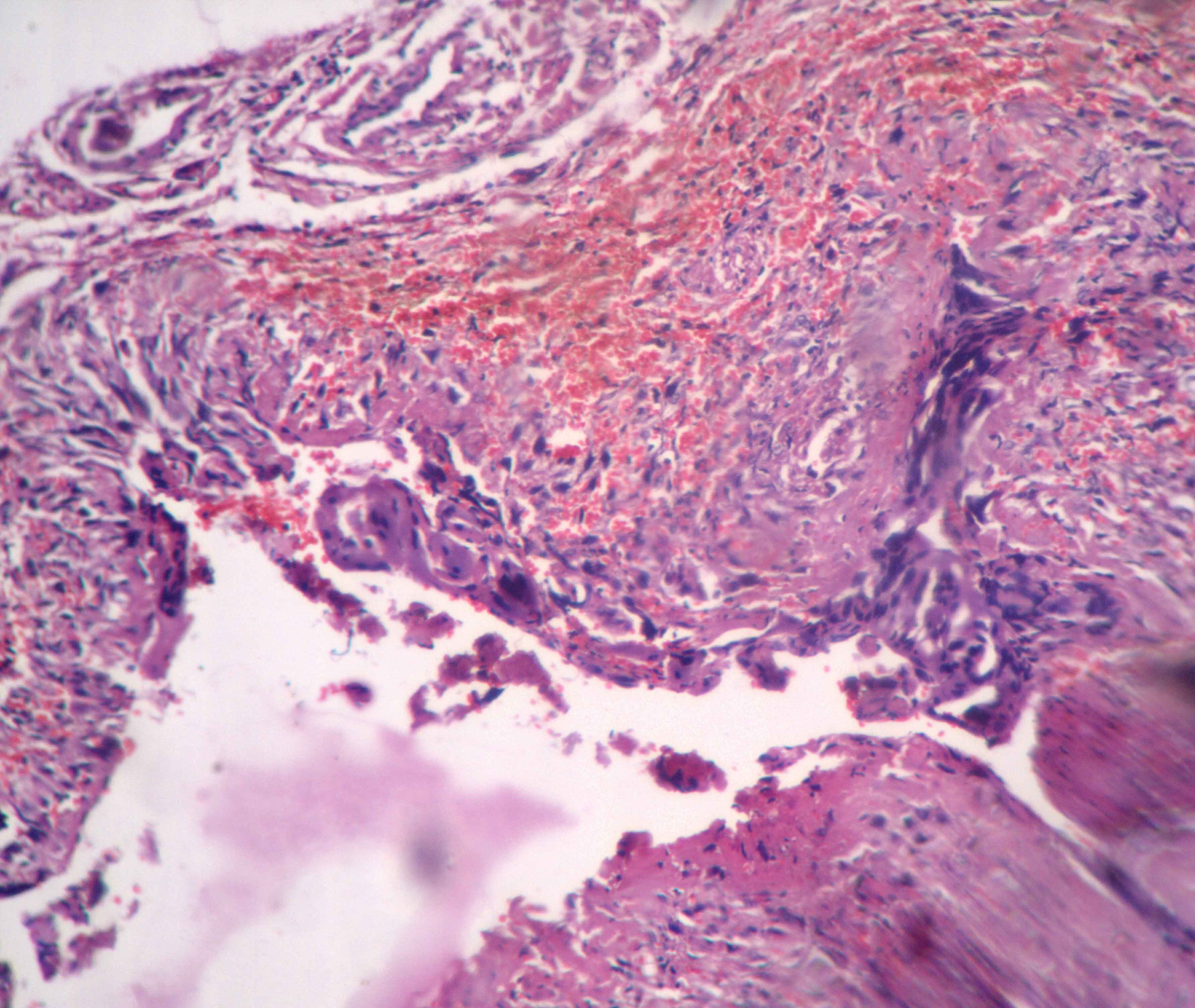 Fallopian tube showing decidual tissue bits with trophoblastic cells. (H & E, x 40)