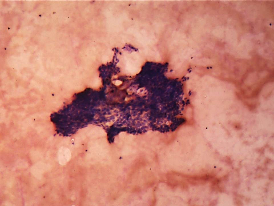 Cytological smear stained with MGG stain shows clusters of hyperchromaticbasaloid cells scattered in the background of red blood cells. (4x)