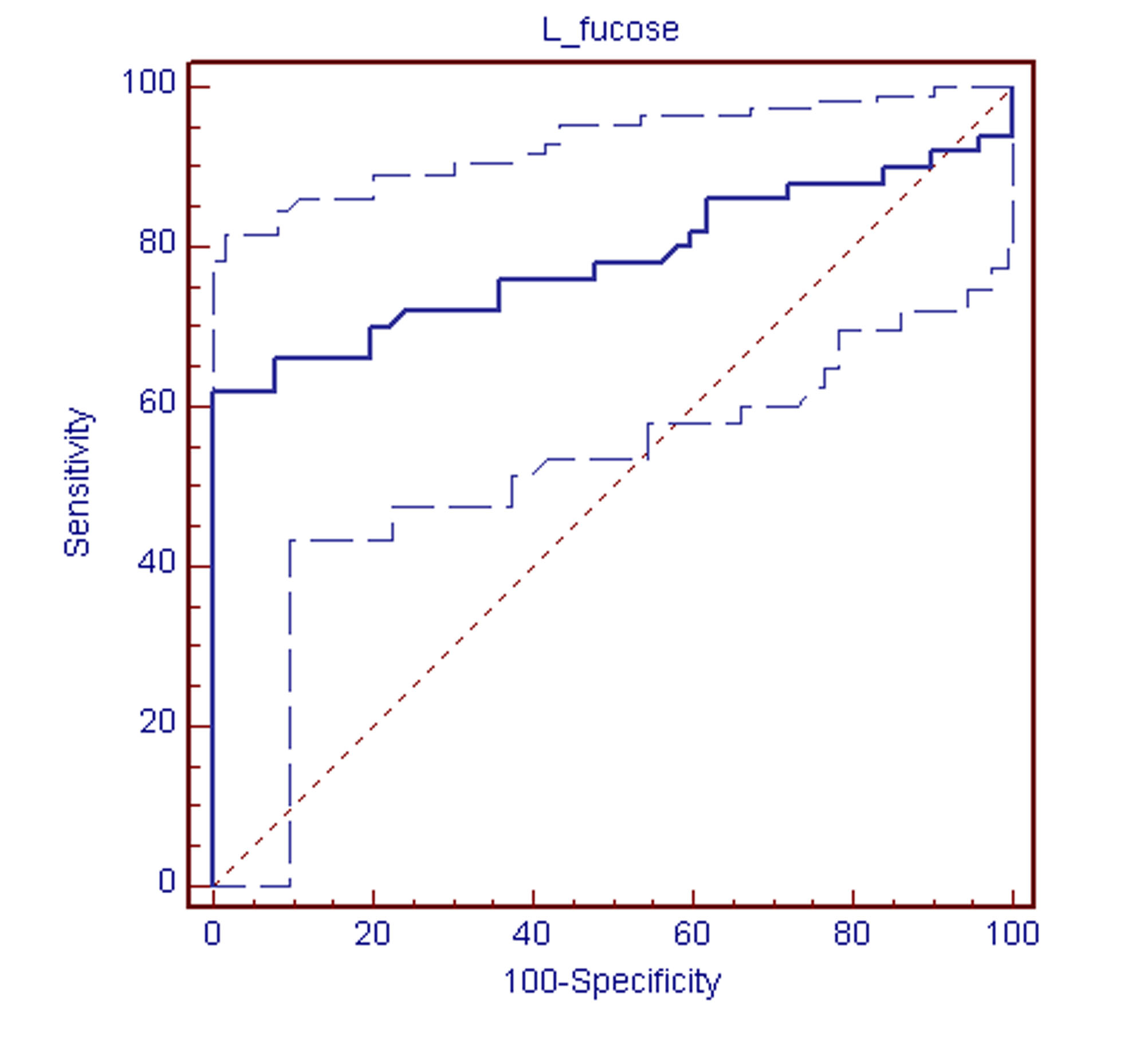 ROC curve analysis for glycoprotein L-fucose to evaluate for diagnostic performance ROC curve analysis shows cut-off >7.90, sensitivity 62%, specificity 100%, positive predictive value (PPV) 100, negative predictive value (NPV) 72.45, accuracy 81.08 and Area Under Receiver Operating Characteristic (AUROC) 0.784