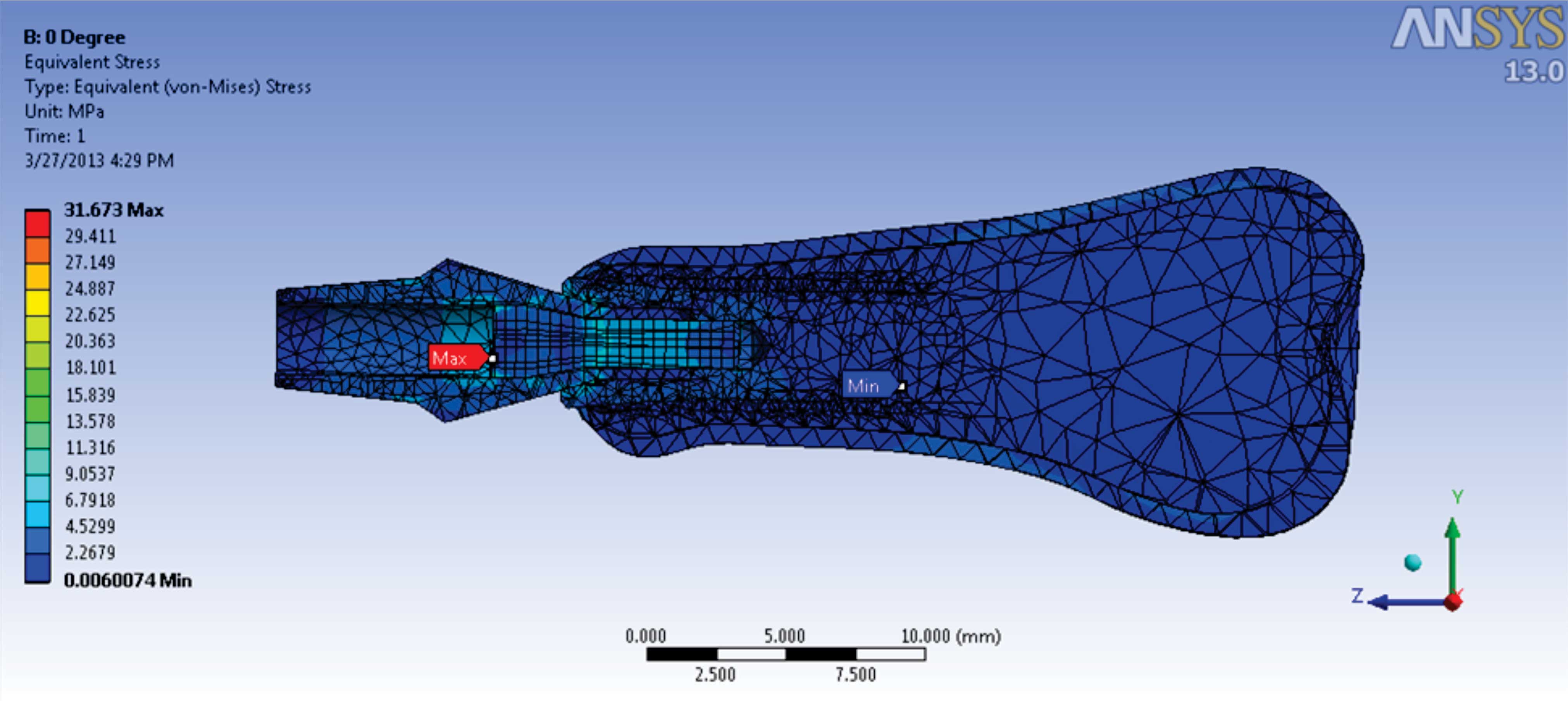 When the force of 50 N loading was done on top of the implant along the axis, the stress distribution ranged from 0.006 to 31.673 MPa.