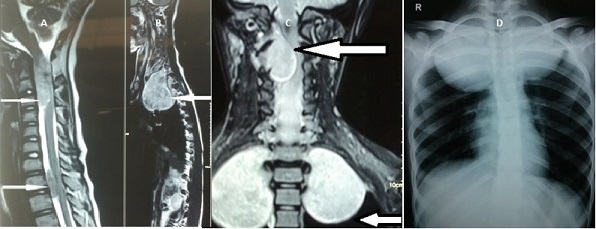 MRI spine (A, B and C) showing intradural extramedullary lesions at C1-C3 and at D1-D3 levels and Posteroanterior Chest radiograph (D) showing tumours occupying both the apices of the lungs.