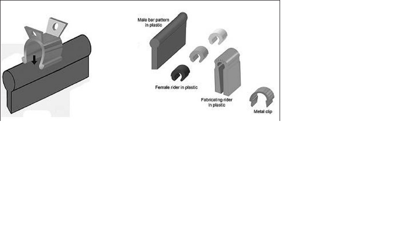 Bar clips or riders are available in different materials and configurations. The metal clips and riders are fully adjustable. Plastic Hader/EDS clips are non-adjustable, but they can easily be replaced at chair side.
