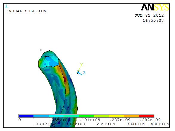 Another 3D-FE model was constructed for a root canal 13 mm long with a curvature of 45-degree angle and 6 mm radius. The model of the canal had an apical foramen of 0.50 mm diameter and about 5% apical taper. The behavior of the 3 brands of NiTi file was analyzed numerically in an FE package (ABAQUS V6.5-1; SIMULIA, Providence, RI) to simulate the bending and torsional conditions during root canal shaping. The file was inserted to the full length of the simulated root canal and the stress distribution on the surface and within the instrument was evaluated.