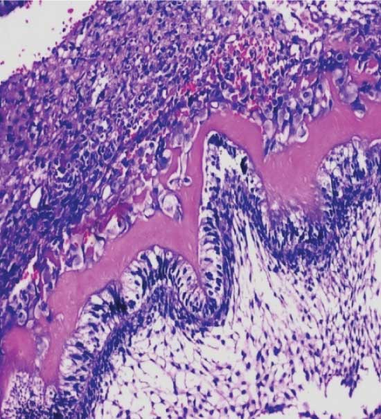 Under high power magnification (40X) shows ameloblast like cells with dental hard tissueformation