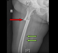 An anteroposterior left femur radiograph showing a transverse shaft fracture, with a localized periosteal beaking (red arrowhead) and generalized cortical thickening (green arrows)