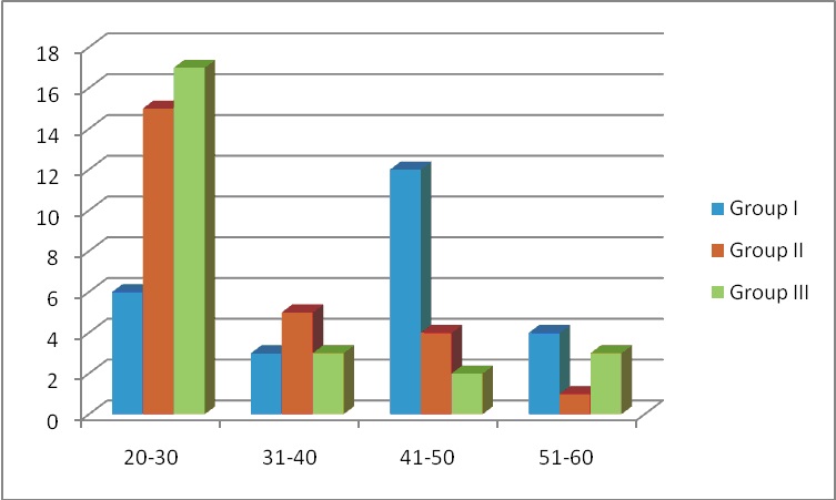 Showing Age Wise Distribution of Subjects Group-I: Leukoplakia, Group-II: Oral Sub Mucous Fibrosis, Group-III: Normal Controls In our study it has been interpreted as above mentioned.