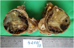 Gross Well-encapsulated circumscribed lesion, consisting of dark brown hemorrhagic areas, with irregular areas of fibrosis, myxoid change, foci of calcification and bone formation.