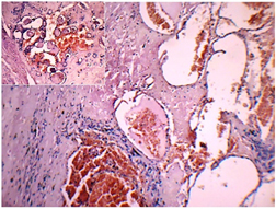 Cavernous spaces with blood and areas of fibrosis. Inset: Thyroid follicles admixed with vascular spaces (H&E X100)