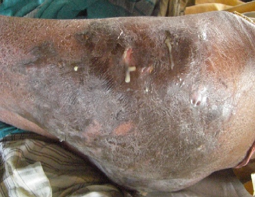 On examination, patient was found to be moderately built and poorly nourished. Local examination showed multiple discharging sinuses over gluteal and perianal regions and upper thighs, as has been shown in [Table/Fig-1,2and3]. Discharge was thick, purulent and without any bony spicules or granules. Sinuses could be probed upto not more than 1 cm. The edges of sinus tracts were undermined and surrounding skin was folded, with thickening and hyperpigmentation. Anal sphincter tone was reduced. Diffuse spinal tenderness was noted over lower lumbar and sacral regions.