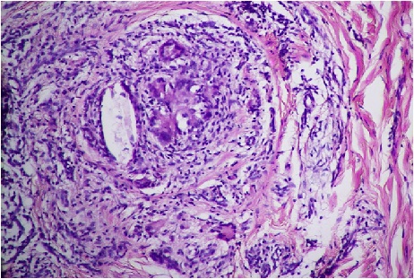 Histopathological examination of sinus tract biopsy showed granulomas in deep dermis, with Langhans giant cells, epitheliod cells and histiocytes, which were suggestive of scrofuloderma, as has been shown in [Table/Fig-4,5].