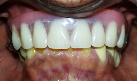 The oral examination along with the recent radiograph showed insufficient bone for implant placement in maxillary posterior region without extensive bone grafting and sinus lift surgery. The patient was not keen for implant supported fixed prostheses because of the additional surgical procedures and the financial limitations and desired a less complicated, yet effective treatment. Radiographic examination revealed availability of sufficient bone for implant placement in the 13, 23 regions. The presence of mandibular anterior teeth opposing maxillary anterior ridge and hence the need to prevent maxillary anterior ridge resorption (Kelly’s combination syndrome) in the future was also a consideration while planning to place implants in the maxillary canine regions bilaterally.