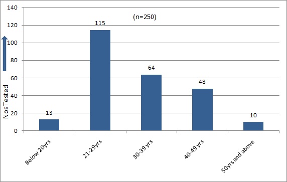 The target population was urban in locale. 76% were non-migrants and 54.4% were illiterate, and only 2.4% were graduates. Most of them were from agricultural background. One hundred and fifteen (46%) of the IDUs were of the age group of 21-29 years [Table/Fig-1]. The male to female ratio was 100: 6.8. The first injecting drug abuse had occurred at the age of 18 years, and the ages of IDUs ranged from 18-67 years [Table/Fig-1]. Fifty Two (20.8%) tested positive for antibodies to HIV 1, 192 (76.8%) were positive for antibodies to HCV and 83(33.2%) were HBsAg positive [Table/Fig-2]. HIV-HCV co-infection was detected in 16% cases (p-value: 0.8536 ), HIV-HBV co-infection was detected in 7.8% cases (p-value : 0.6149) and HIV and HBV co-infection was seen in 7.2% cases (p-value: 0.6149 ). HIV-HBV-HCV co-infection was seen in 6% of the IDUs. Co-infections were not statistically significant [Table/Fig-2,3].