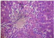 Administration of the different doses of GOV did not show diffuse microvesicular steatosis [Table/Fig-8,9and10]. However, there was minimal periportal lymphocytic infiltration with necrosis at different concentrations of the extract compared to animals in the toxin group. The morphology of liver of rats in Liv 52 and silymarin groups were almost normal.
