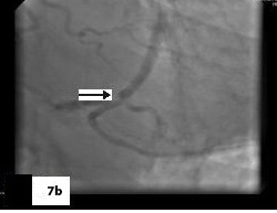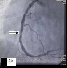 Catheter angiography image showing complete occlusion of LAD in \ proximal segment (arrow)