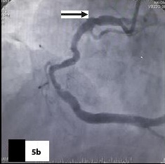 Catheter angiography image showing significant stenosis of OM1 at origin Significant disease in the absence of calcification