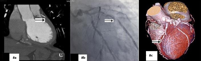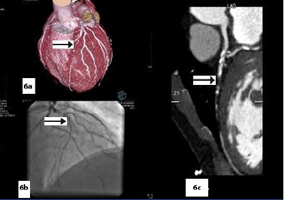 (Sagittal), (Axial), (VRT) images & catheter angiography image showing significant stenosis in mid LAD